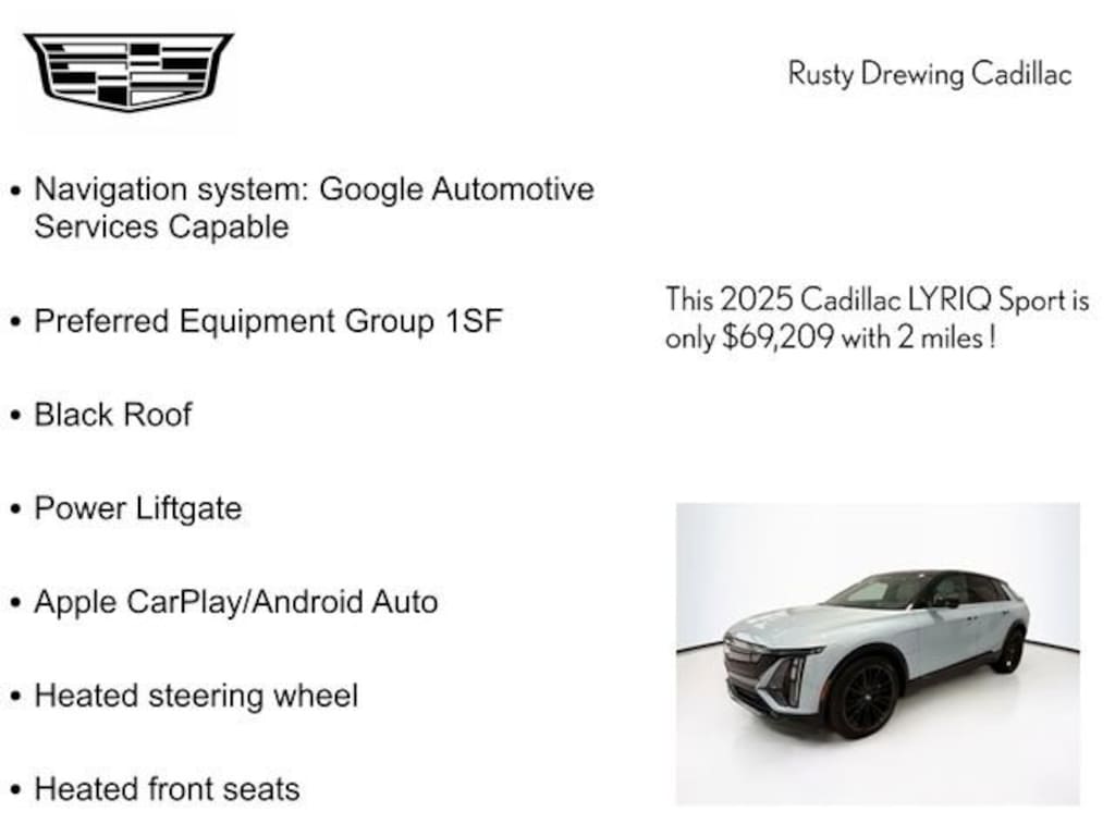 Nimbus Met 2025 Cadillac LYRIQ Sport 1-Speed Automatic Electric Drive Unit LYRIQ Sport, 4D Sport Utility, Electric Drive Unit, 1-Speed Automatic, Nimbus Met, Sky Gry With Santori, Apple CarPlay/Android Auto, Black Roof, Heated front seats, Heated steering wheel, Navigation system: Google Automotive Services Capable, Power Liftgate, Preferred Equipment Group 1SF.