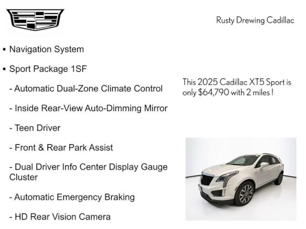 Crystal White 2025 Cadillac XT5 Sport AWD 9-Speed Automatic 3.6L V6 DI VVT XT5 Sport, 4D Sport Utility, 3.6L V6 DI VVT, 9-Speed Automatic, AWD, Crystal White, Cirrus Leather, 8 Color Driver Info Center Display Gauge Cluster, Adaptive Cruise Control, Automatic Dual-Zone Climate Control, Automatic Emergency Braking, Automatic Parking Assist w/Braking, Automatic Seat Belt Tightening, Bose Performance Series 14-Speaker System, Driver Assist Package, Dual Driver Info Center Display Gauge Cluster, Enhanced Automatic Emergency Braking, Floor Liner Package (LPO), Front & Rear Contoured Floor Liners (LPO), Front & Rear Park Assist, HD Rear Vision Camera, HD Surround Vision, Head-Up Display, Heated Driver & Front Passenger Seats, Heated steering wheel, Hitch Guidance, Hitch Guidance w/Hitch View, Inside Rear-View Auto-Dimming Mirror, Integrated Cargo Liner (LPO), Navigation System, Power Liftgate, Power moonroof: UltraView, Radio: Cadillac User Experience w/Embedded Nav, Rear Camera Mirror, Rear Camera Mirror Washer, Rear Pedestrian Alert, Reverse Automatic Braking, SiriusXM w/360L Trial Subscription, Smart Towing, Sport Package 1SF, Technology Package, Teen Driver, Ventilated Driver & Front Passenger Seats, Wireless Apple CarPlay/Wireless Android Auto, Wireless Phone Charging.