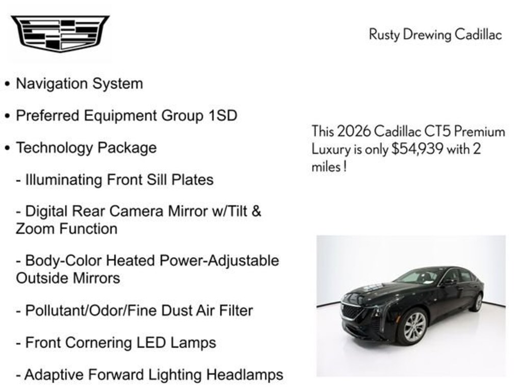 Raven Black 2026 Cadillac CT5 Premium Luxury RWD 10-Speed Automatic 2.0L I4 Turbocharged DOHC 16V LEV3-SULEV30 237hp CT5 Premium Luxury, 4D Sedan, 2.0L I4 Turbocharged DOHC 16V LEV3-SULEV30 237hp, 10-Speed Automatic, RWD, Raven Black, Jet Blk With Jet Blk Acce Leather, Adaptive Forward Lighting Headlamps, Air Quality Indicator Sensor, Apple CarPlay/Android Auto, Automatic Leveling System Headlamp Control, Body-Color Heated Power-Adjustable Outside Mirrors, Digital Rear Camera Mirror w/Tilt & Zoom Function, Exterior Parking Camera Rear, Front Cornering LED Lamps, Hands-Free Decklid Release, Head-Up Display, Heated Driver & Front Passenger Seats, Illuminating Front Sill Plates, Navigation System, Pollutant/Odor/Fine Dust Air Filter, Preferred Equipment Group 1SD, Premium Headlamp System, Technology Package, UltraView Dual Pane Sunroof, Ventilated Driver & Front Passenger Seats. Price includes: $1000 - Cadillac Financial APR & Down Payment Assistance Program: $1000 discount and 3.40% APR for 36 months. $29.26 per $1000 financed. Available to well qualified buyers who finance through Cadillac Financial. XGA. Exp. 01/02/2026 $500 - Cadillac Bonus Cash Program. Exp. 01/02/2026