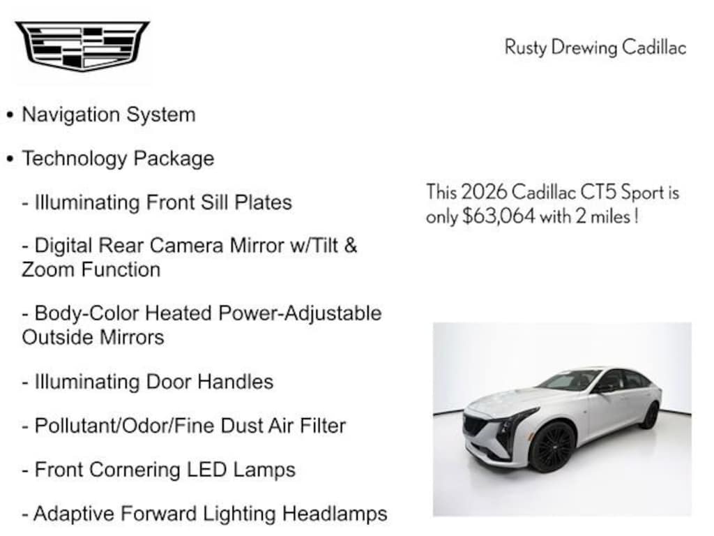 White 2026 Cadillac CT5 Sport 10-Speed Automatic 2.0L I4 Turbocharged DOHC 16V LEV3-SULEV30 237hp CT5 Sport, 4D Sedan, 2.0L I4 Turbocharged DOHC 16V LEV3-SULEV30 237hp, 10-Speed Automatic, White, Jet Blk Lth With Mini-Per, Adaptive Forward Lighting Headlamps, Air Quality Indicator Sensor, AKG 15-Speaker System, Apple CarPlay/Android Auto, Automatic Leveling System Headlamp Control, Black Grille (LPO), Black Wheel Locks (LPO), Black Wheel Lug Nuts (LPO), Body-Color Heated Power-Adjustable Outside Mirrors, Digital Rear Camera Mirror w/Tilt & Zoom Function, Exterior Parking Camera Rear, Front Cornering LED Lamps, Gloss Black Nameplates (LPO), Gloss Black Rear License Plate Applique (LPO), Hands-Free Decklid Release, Head-Up Display, Heated Driver & Front Passenger Seats, Illuminating Door Handles, Illuminating Front Sill Plates, Navigation System, Onyx Package (LPO) w/Black Raven, Pollutant/Odor/Fine Dust Air Filter, Premium Headlamp System, Technology Package, UltraView Dual Pane Sunroof, Ventilated Driver & Front Passenger Seats, Wheels: 20 Alloy w/Gloss Black Finish (LPO), Wheels: 20 Transit. Price includes: $1000 - Cadillac Financial APR & Down Payment Assistance Program: $1000 discount and 3.40% APR for 36 months. $29.26 per $1000 financed. Available to well qualified buyers who finance through Cadillac Financial. XGA. Exp. 02/02/2026 $500 - Cadillac Bonus Cash Program. Exp. 02/02/2026