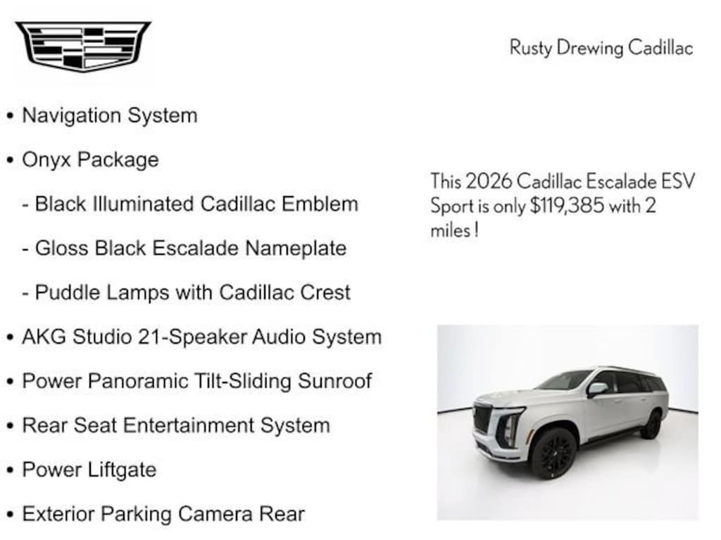 White 2026 Cadillac Escalade ESV Sport 4WD 10-Speed Automatic with Overdrive 6.2L V8 Escalade ESV Sport, 4D Sport Utility, 6.2L V8, 10-Speed Automatic with Overdrive, 4WD, White, Jet Blk Lth With Precisi Leather, AKG Studio 21-Speaker Audio System, Apple CarPlay/Android Auto, Black Illuminated Cadillac Emblem, Exterior Parking Camera Rear, Gloss Black Escalade Nameplate, Heated and Ventilated Driver and Front Passenger Seats, Heated rear seats, Heated steering wheel, Navigation System, Onyx Package, Power Liftgate, Power Panoramic Tilt-Sliding Sunroof, Puddle Lamps with Cadillac Crest, Rear Seat Entertainment System.Awards:* Car and Driver Editors' ChoiceCar and Driver, January 2017.