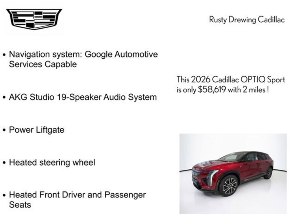 Radiant Red 2026 Cadillac OPTIQ Sport AWD 1-Speed Automatic Electric Motor OPTIQ Sport, 4D Sport Utility, Electric Motor, 1-Speed Automatic, AWD, Radiant Red, Sky Gry With Santori, AKG Studio 19-Speaker Audio System, Heated Front Driver and Passenger Seats, Heated steering wheel, Navigation system: Google Automotive Services Capable, Power Liftgate.