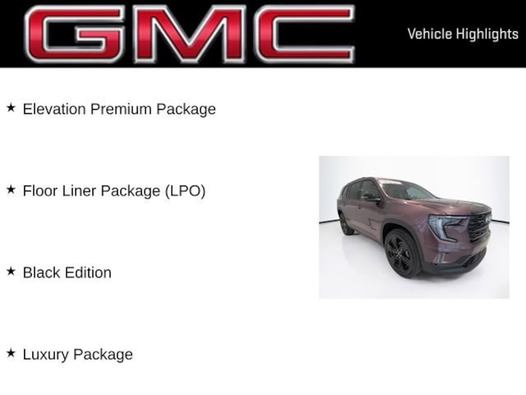 Crystal Met 2026 GMC Acadia Elevation AWD 8-Speed Automatic 2.5L DOHC Acadia Elevation, 4D Sport Utility, 2.5L DOHC, 8-Speed Automatic, AWD, Crystal Met, After Dk Coretec Cloth, 1st & 2nd Row All-Weather Floor Liner (LPO), 3-Channel Programmable Universal Home Remote, 3rd Row All-Weather Floor Liner (LPO), 6-Way Power Front Passenger Seat Adjuster, 7-Passenger Seating (2-2-3 Seating Configuration), 8 Diagonal Head-Up Display, Black Edition, Bose Premium 12-Speaker System w/Sub-Woofer, CoreTec Seat Trim, Elevation Premium Package, Exterior Parking Camera Rear, Floor Liner Package (LPO), Front & Rear Black GMC Emblems (LPO), Front Passenger Power Lumbar Seat Adjuster, Gloss Black Roof Rails, Heated Rear Outboard Seating Positions, Heated steering wheel, Heated Wiper Park, High Gloss Black Door Upper Moldings, Integrated Cargo Liner (LPO), Laminated Acoustic Glass, Luxury Package, Navigation System, Power Liftgate, Wheels: 22 x 8.5 Gloss Black Aluminum.