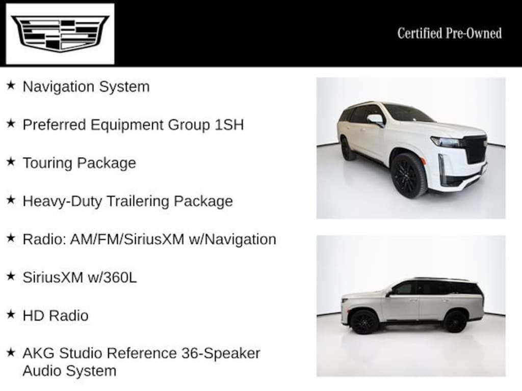 Certified. CARFAX One-Owner. Crystal White Tricoat 2022 Cadillac Escalade Sport Platinum 4WD 10-Speed Automatic 6.2L V8 Escalade Sport Platinum, 4D Sport Utility, 6.2L V8, 10-Speed Automatic, 4WD, Crystal White Tricoat, Jet Black Leather, 16.9 Diagonal OLED Infotainment Screen, 2-Presets Memory For Driver Seat Adjuster, 2-Speed Active Transfer Case, 3rd row seats: split-bench, 4-Way Power Front Passenger Lumbar Seat Adjuster, Adaptive Cruise Control, Air Ride Adaptive Suspension, AKG Studio Reference 36-Speaker Audio System, Apple CarPlay/Android Auto, Automatic Seat Belt Tightening, Automatic Stop/Start, Body-Color Door Handles, Door Lock & Latch Shields, Electronic Limited-Slip Differential, Enhanced Automatic Emergency Braking, Enhanced Automatic Parking Assist, Extra Capacity Cooling System, Floor Console w/Covered Storage, Front Auxiliary 12-volt Power Outlet, Glass Breakage Sensor, HD Radio, Heated & Ventilated Driver & Front Passenger Seats, Heated door mirrors, Heated Driver & Front Passenger Seats, Heated front seats, Heated rear seats, Heated steering wheel, Heavy-Duty Trailering Package, Hitch Guidance w/Hitch View, Illuminating Front & Rear Sill Plates, Integrated Trailer Brake Controller, Navigation System, Platinum Interior Trim, Power Liftgate, Power moonroof, Power Panoramic Tilt-Sliding Sunroof, Preferred Equipment Group 1SH, Radio: AM/FM/SiriusXM w/Navigation, Rear Camera Mirror, Rear Camera Mirror Washer, Rear Cross Traffic Alert, Rear Seat Entertainment System, Reconfigurable Full-Color Head-Up Display, Reverse Automatic Braking, Running Board Assist Steps, SiriusXM w/360L, Smart Trailer Integration Indicator, Soft Closing Front & Rear Doors, Start/Stop System Disable Button, Teen Driver, Theft-Deterrent Alarm System, Touring Package, Trailer Side Blind Zone Alert, Trailer Tire Pressure Monitoring System, Trailering Assist Guidelines, Vehicle Inclination Sensor, Vehicle Interior Movement Sensor, Wired Auxiliary Trailer Camera (LPO), Wireless Apple CarPlay/Wireless Android Auto.